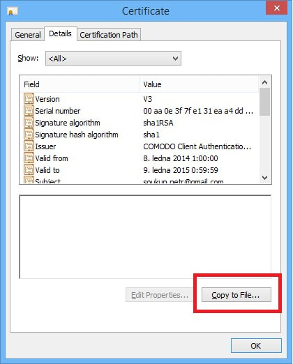 - Klikněte zobrazit certifikát a Kopírovat do souboru