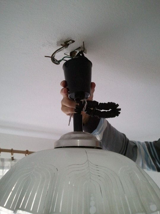 Nové kanceláře ale nejsou nijak zařízené. Kromě stolů tam není vůbec nic - v některých místnostech ani světla. Naštěstí jsme kluci šikovní a poradili jsme si. Na následujícím obrázku uvidíte vyrobení světla v jedné z kanceláří. Světlo je původně z (budoucí) zasedačky, je zkrácené pomocí síťového kabelu a ke stropu je uchyceno pomocí kusu ramínka. Ještě že máme ve firmě dva vystudované elektrotechniky.Snad nevyhoříme.